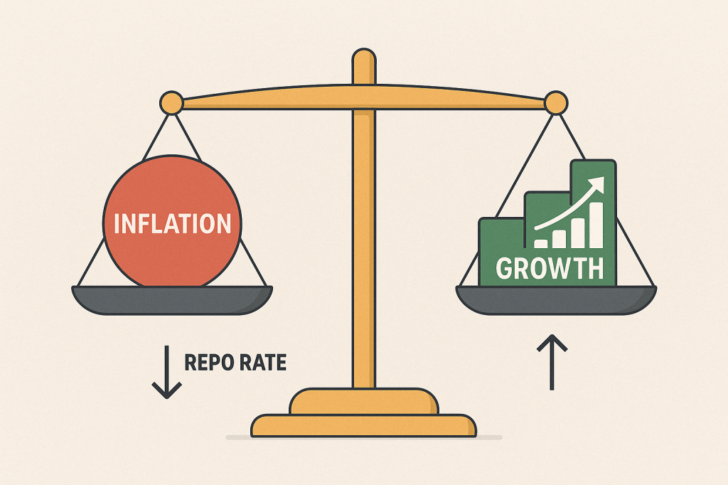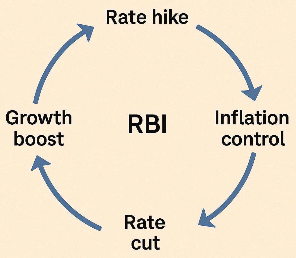 But if the economy is growing slowly and people are not spending enough, RBI might cut interest rates. This encourages borrowing and spending.