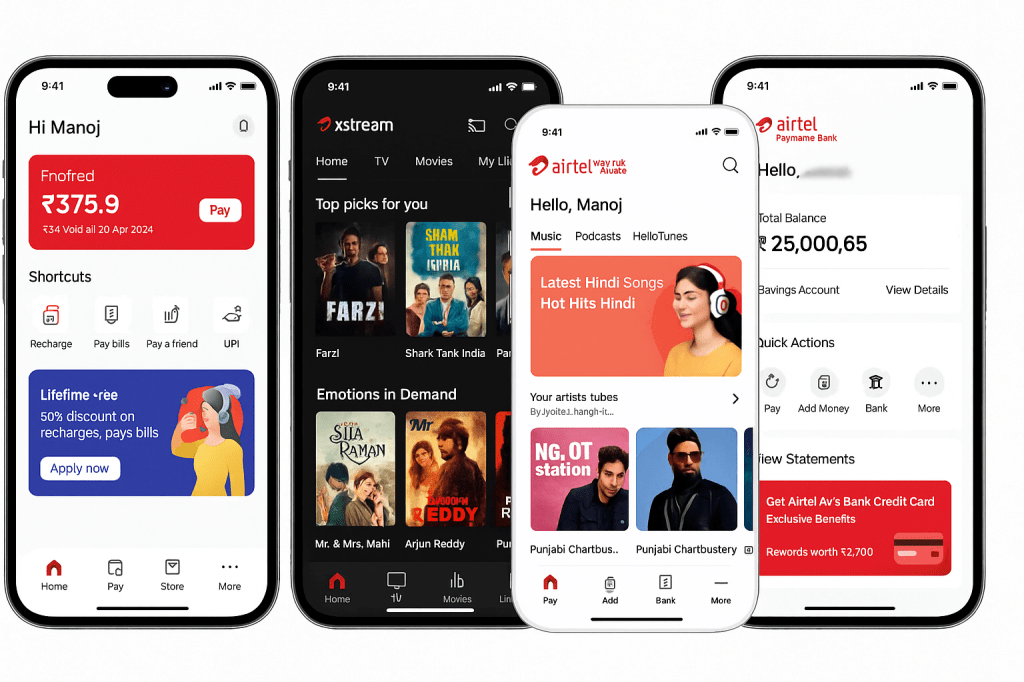 Through apps like Wynk Music, Airtel Xstream, and Thanks, it built a complete digital ecosystem. Music, movies, payments, OTT subscriptions — all in one place.